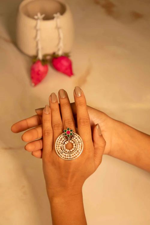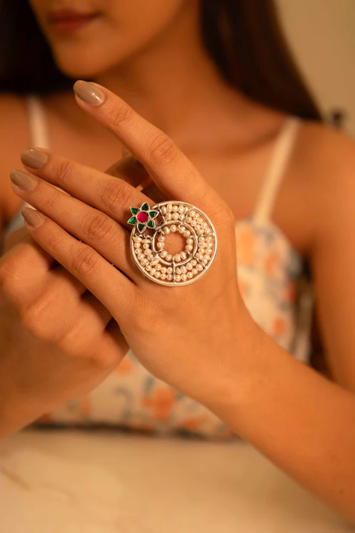 Elevate your style with the Qurbat Statement Ring, a stunning blend of concentric pearls and a vibrant kundan flower motif. This eye-catching piece features a central red kundan stone surrounded by lush green accents, framed with delicate pearl layers for a timeless appeal. Perfect for adding a touch of sophistication to any outfit.