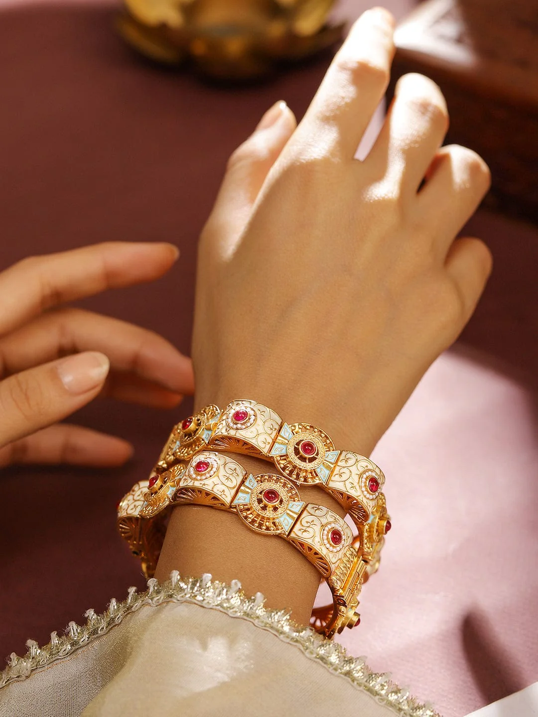 vibrant red stones, pearl accents, and detailed blue and peach enamel