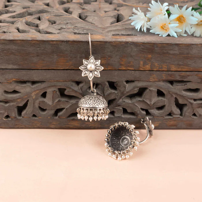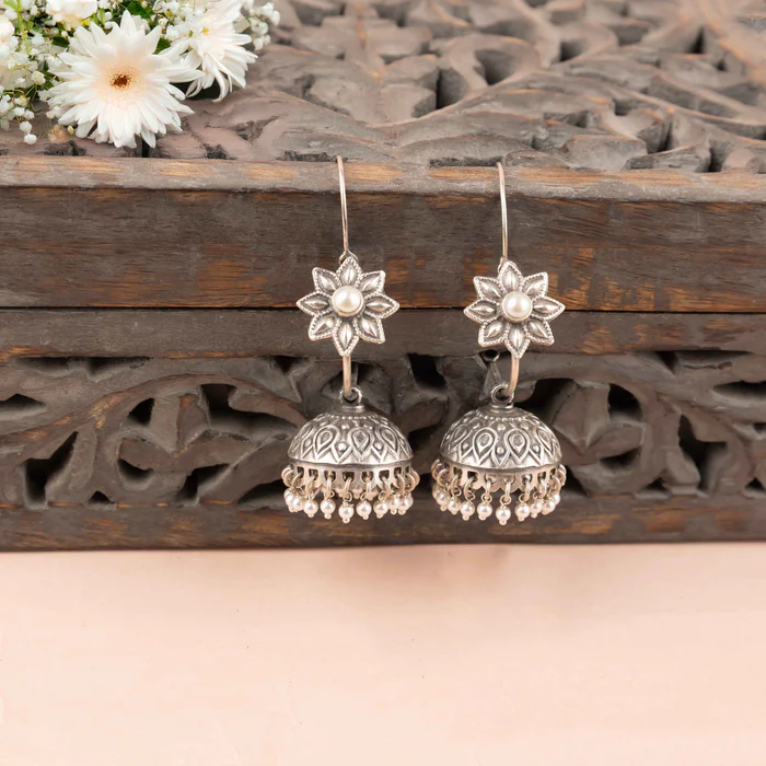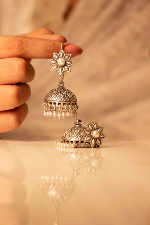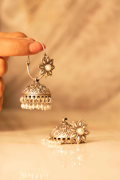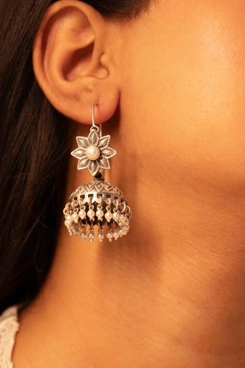 Celebrate the timeless elegance of traditional craftsmanship with the Dulari Intricate Pearl Embossed Bali Jhumka, where heritage meets contemporary grace. These stunning earrings feature an exquisite floral motif at the top, intricately embossed with delicate petals that catch light beautifully. The classic jhumka silhouette cascades into a perfectly proportioned bell shape, adorned with lustrous pearl drops that create gentle movement and musical charm with every turn of your head. The intricate detailing throughout the piece showcases masterful silversmithing, while the pearl accents add a touch of refined femininity.